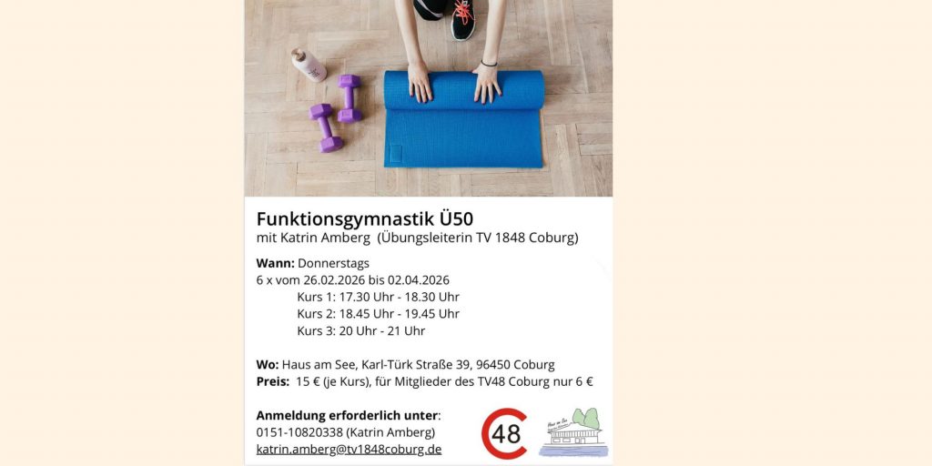 Ab dem 26.02.2026 startet donnerstags wieder die Funktionsgymnastik Ü50 mit Katrin Amberg (TV 1848 Coburg). Der Kurs findet im Haus am See statt und umfasst…