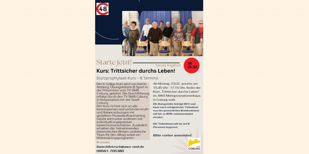 Ab dem 23.02. startet im AWO Mehrgenerationenhaus Coburg der neue Sturzprophylaxe-Kurs „Trittsicher durchs Leben“.Der sechsteilige Kurs wird von Katrin Amberg geleitet und richtet sich an alle Interessierten,…