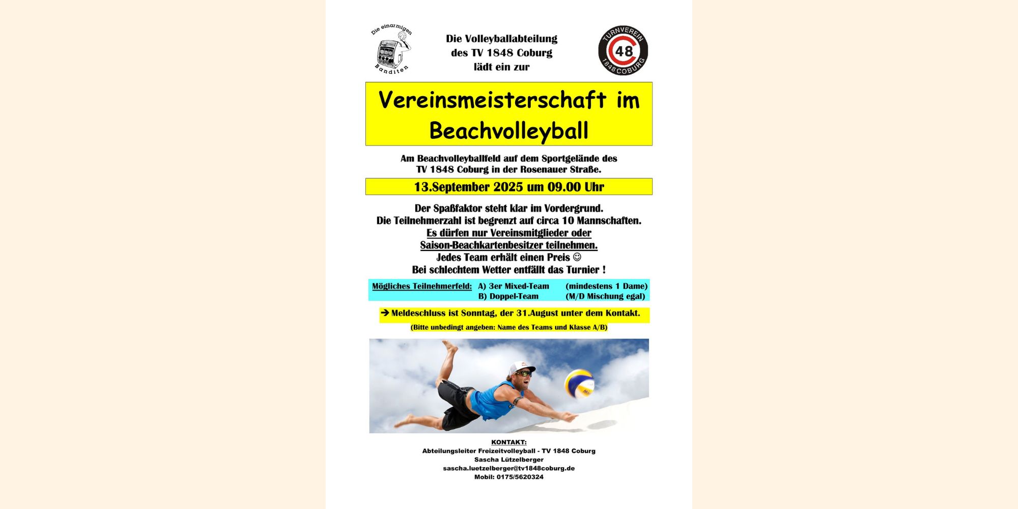COBURG - Am 13.September wurde die Vereinsmeisterschaft im Beachvolleyball ausgetragen. Unter den 6 Teams waren jeweils 5 Doppel-Teams und ein Mixed-Team am Start. Bei herrlichem Wetter durfte jeder gegen jeden